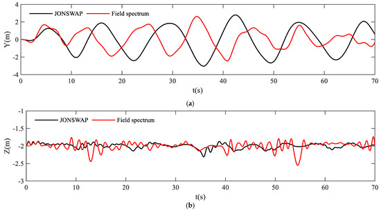 For the translational motion, the motion trajectory of the lumped masses of the slender cylinder were emphatically analyzed, and the time series of the motion trajectory was converted into a frequency curve by fast Fourier transformation [36]. Furthermore, the response frequency of the translational motion of the slender cylinder was analyzed. Figure 10 and Figure 11 are the time series and converted frequency curves of the centroid motion of the slender cylinder obtained by the JONSWAP and field spectrum. The amplitude and period of the centroid translation of slender cylinder in the Y and Z directions of JONSWAP spectrum and field spectrum are basically identical, i.e., it is not affected by the secondary peak frequency of the field spectrum. In addition, their response frequency and period are also relatively close. On the one hand, their response frequencies are 0.078 Hz and 0.097 Hz, respectively. On the other hand, their corresponding periods are 12.82 s and 10.31 s in turn, and they are close to 12.5 s. In Figure 11b, the motion in Z direction has no peak frequency of response. The reason why this phenomenon happened is that the motion of slender cylinder in the Z direction is mainly affected by the gravity, buoyancy, and the tension of mooring cable.