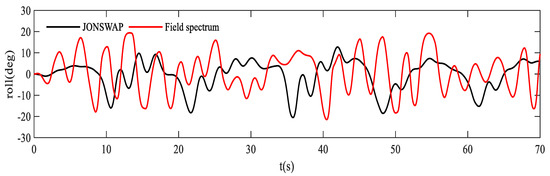 Similarly, the angular rotation of slender cylinder around the X axis was transformed into a frequency curve by the fast Fourier transformation method, as shown in Figure 12 and Figure 13. In Figure 12, the amplitude of rotation angle of the JONSWAP spectrum and field spectrum is basically same, but there is a big difference in response frequency. It can be seen from Figure 13 that the peak frequency of the rotation angle response of the slender cylinder calculated by the JONSWAP spectrum is only 0.078 Hz, while there are two peak frequencies calculated by the field spectrum, namely 0.097 Hz and 0.312 Hz. The amplitude corresponding to large frequency is larger than that corresponding to small frequency, indicating that the rotation angle of moored structure is more likely to resonate with the secondary peak frequency in the wave spectrum. Therefore, it is necessary to pay more attention to the influence of the secondary peak frequency of typhoon waves on engineering safety.