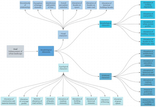 Criteria related to the morphological dimension for the evaluation of the impact of the resource flow management service on the urban landscape. The chosen criteria are aimed at protecting the morphological aspects of the urban landscape. At the vertex of the hierarchy is the general goal of the decisional process. (Source: Author’s processing).