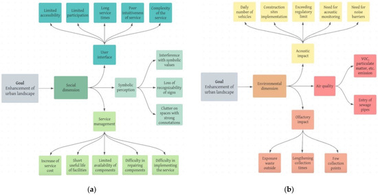 Evaluation criteria for the impact of the resource flow management service in the urban landscape. (a) Criteria for the environmental dimension of the urban landscape. (b) Criteria for the social dimension of the urban landscape. Source: Author’s processing.