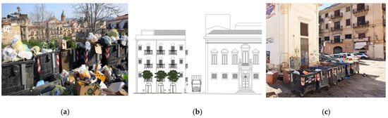 Partial waste sorting. (a) Dumpsters on the edge of the street in the historical center; 2015 image (Source: La Repubblica Palermo). (b) Graphical representation of the space occupied by a compactor truck in an internal street of the historical center (Source: Author’s processing). (c) Current collection area in a square in the historical center of Palermo; 2022 image (Source: Google Maps).