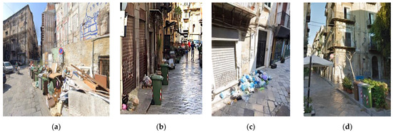 According to 2018 estimates, this scenario resulted in a low percentage of sorted waste (10.48%) [24]. Another criticality was the greenhouse gas emissions from the huge quantities of street waste and the transportation means that collected disposed waste to take it to the plant. Polluting gas production sensibly altered the olfactory fruition of urban space, which is constituted by low-air-circulation areas: this led to a congested situation, with poor levels of atmospheric quality. The alteration of the environmental landscape had negative effects on acoustic comfort during waste collection and vehicle circulation, especially in streets with a reduced road section, where the resonance of compactor trucks could be perceived more. Despite having a temporary character over the day, these impacts occurred daily and negatively affect the environmental landscape quality, in addition to hindering the fruition of urban space or its parts.