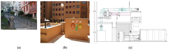 Automated vacuum waste collection system. (a) Columns for waste disposal in the urban center of Vitoria-Gasteiz, Spain. (b) Columns for waste disposal integrated into buildings, Madrid, Spain. (c) Waste separation process at the arrival at the collection station (Source: Envac Iberia S.A.).