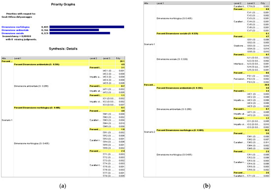 The weights of the scenarios for each criterion (local weights) are calculated with the eigenvalue power method for the main eigenvector. The result is a single vector for each scenario and each criterion. The summation of the components of the vectors provides a single vector; its normalization produces a unitary versor. The versor allows obtaining the preferability rate of a given scenario for each criterion: w1/w; w2/w; w3/w. Local weights are multiplied by the weights of the corresponding superordinated criteria, hence obtaining the values of the global weights. In this research work, the weights of the criteria depend on the importance of each criterion for the achievement of the general goal. This importance has been determined through a pairwise comparison between the criteria during the hierarchical organization phase of the analysis model (see Figure 8a–d).