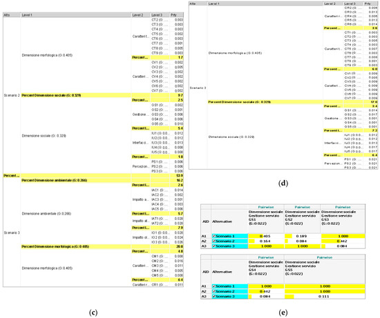 Synthesis of results: goal fulfillment rate for each scenario, dimension, and criterion. (a) Data related to scenario 1, with an overall 20%. (b) Data related to scenario 2, with an overall 27%. (c,d) Data related to scenario 3, with an overall 53%. (e) Extract of the results of the pairwise comparison: consider criterion GS5 (service implementation), where the goal is completely fulfilled in scenarios 1 and 2 (with a simple implementation, as they do not require complex technological infrastructures) and is associated with a value of 1; compared to the other two, scenario 3 is more complex as it includes an articulate network below the roadway and so its score is lower than the other two by 90%. In figures (b,c), respectively, scenarios 1 and 2 have a value of 0.1 for the criterion GS5, while in figure (d) an approximate value of 0.01 is visible for scenario 3. The criteria are expressed in Figure 1 and Figure 2. (Source: Author’s processing). For (a–d), the name of the indicator relating to the analyzed dimension is abbreviated in the Level 2 column (the full name is visible in Figure 2 and Figure 3). In the Level 3 column the indicator is identified with a code.