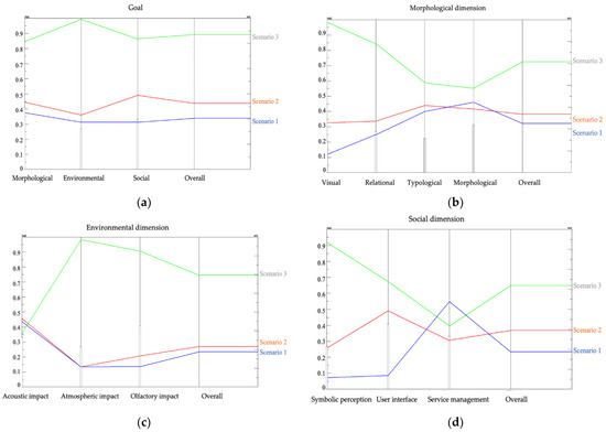 Graphical synthesis of the results by dimension and scenario. (a) Morphological dimension. Various criteria are related to the conservation of the characteristics of the urban landscape. For example, in scenario 3 the installation of the pipelines implies a modification of the roadway, with a possible alteration of the pavement. In scenarios 1 and 2, during waste delivery hours there could be influences on the readability of the typological and constructional characteristics of the building, up to the distortion of unique elements that characterize the historical and/or cultural image. (b) Environmental dimension. One of the relevant factors is the acoustic impact, considered in the evaluation criteria with respect to the implementation, operation, and—if present—maintenance phases. The composition of positive and negative aspects for each criterion reveals that the scenarios are almost equivalent. (c) Social dimension. The linear anomaly point in the diagram can be related to the difficulty in implementing the service and to the additional difficulty in the obtainment and substitution of components. (d) General goal. Scenario 3 is closer to the general goal, especially in relation to the environmental sphere of the urban landscape. (Source: Author’s processing).