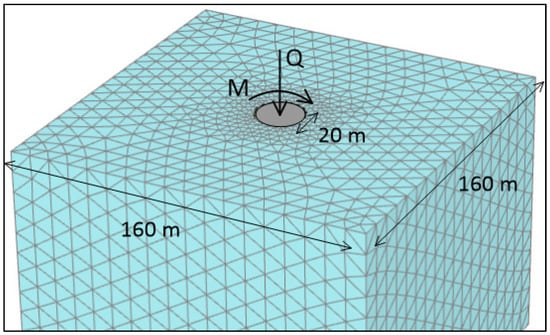A 3D finite element analysis was used to translate the above constraints in settlement and rotation into bearing moment and vertical load and create a limit envelope (Figure 2). The raft was modeled as a rigid body; the wind turbine structure usually does not significantly affect the foundation’s stiffness for onshore wind turbines with a raft foundation. This happens because the raft foundation is very stiff, e.g., built by reinforced concrete of a significant thickness and size, and can be considered rigid. The vertical load and the bearing moment were applied at the center of the foundation; the distribution of the superstructure loads on the foundation affects the results. However, this effect is not significant for the soil settlements and can be neglected if only the soil and not the superstructure is under investigation. The simplified simulation of this work is then good enough to evaluate the soil response [24].