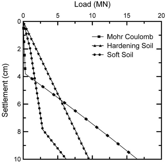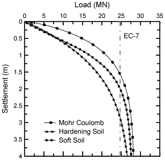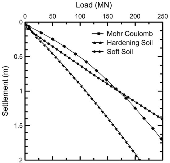 Initially, the load-displacement curve of the footing was obtained. Figure 9 shows the soil’s response to the three constitutive models mentioned in Section 2. Although the footing’s bearing capacity is relatively high, the settlements are enormous. The three constitutive models show similar results with major differences referring to the emerging settlements. The Mohr–Coulomb model exhibits considerably lower settlements compared to the other two models throughout the range of loads. The Hardening Soil and Soft Soil initially (for small loads) behave similarly, but for larger loads (>10 MN), the Hardening Soil exhibits larger settlements. The bearing capacity was also calculated using the relationships of the Eurocode-7 [31] equal to 24.7 MN, slightly less than the numerical values.