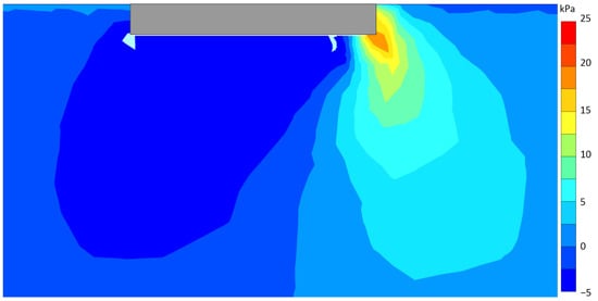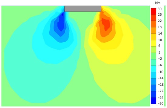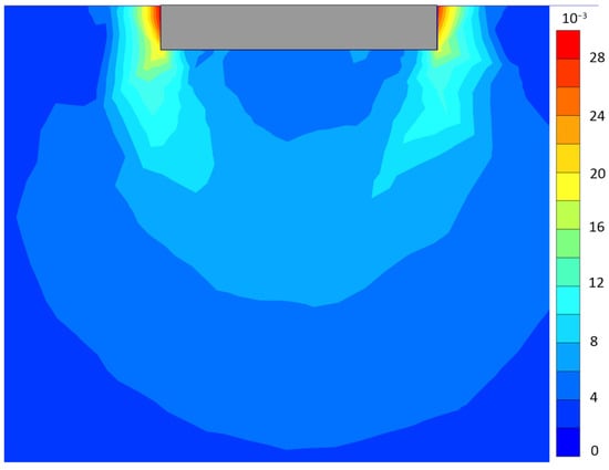 After computing the maximum vertical load, the foundation was examined for combined vertical load Q and bending moment M. Initially, the foundation was subjected to a vertical load (smaller than the maximum allowed). Then a bending moment was applied to reach the 0.1° rotation. An empirical procedure was followed to find the bending moment that caused this rotation angle based on the rigid foundation’s response. The accuracy of the relationship between the rotation and the bearing moment was further validated by applying the rotation separately as a boundary condition and obtaining the same result. Figure 5 presents the soil displacements for the Mohr–Coulomb model when the foundation was subjected to a 1 MN vertical load and a 35 MN-m bending moment (approximately 0.1° of rotation). The maximum settlement of approximately 6 cm corresponds to the edge of the footing. Additionally, Figure 6 illustrates the shear stresses for the same conditions. Similarly, the maximum shear stress is at the edge of the footing, where plasticity has been developed.