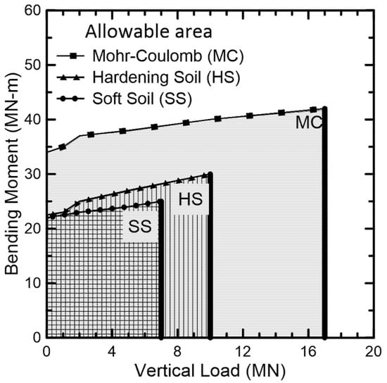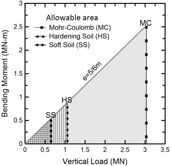 The serviceability envelope was created by the bending moment, and vertical load combinations that produced rotations and settlements less than the constraints discussed previously (Figure 7). By comparing these results with the typical medium-size wind turbine loads, it is concluded that shallow raft foundations are not a practical solution to the installation of wind turbines on this material. The allowed loading combinations based on the numerical analysis do not include medium-sized wind turbine typical loads. The critical problem is primarily with the bending moment. Moments up to 40 MN-m are acceptable according to the widest envelope (Mohr–Coulomb), while for the other two constitutive models, the respective value is of the order of 25–30 MN-m.