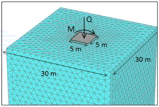 A 3D finite element analysis was employed to create the limit envelope due to the 3D geometry of the footing and the non-symmetric loading type. A building has several footings, but each is assumed to be isolated for simplicity and without losing generality, as different footings are far enough to prevent interaction. A single footing was analyzed, simulated as a rigid body in that vein. Triangular 10-noded elements were used, and the finite element mesh was appropriately chosen to minimize boundary effects. The average spoil material properties were used to obtain an average response. The footing was placed on the grid’s center, fully embedded in its depth of 0.80 m, and the mesh was refined around the footing. Figure 8 shows an overview of the 3D discretization of the finite element model.