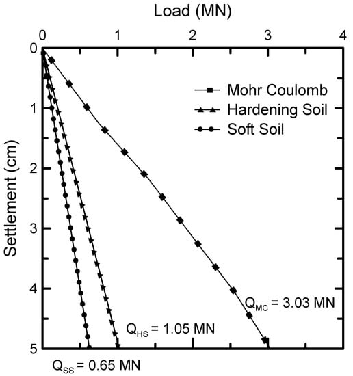 Moreover, according to Eurocode-7 [29], settlements up to 5 cm are acceptable for structures founded on isolated footings. The 5 cm is a typical limit value [33] larger than the 2.5 cm limit value also used for the allowable settlements of isolated footings, e.g., see [26,34]. The 3D finite element analysis described above was employed to obtain the vertical load corresponding to a 5 cm settlement. When the settlement reaches 5 cm, the corresponding vertical loads are marked in Figure 10: QMC = 3.03 MN for the Mohr–Coulomb, QHS = 1.05 MN for the Hardening Soil, and QSS = 0.65 MN for the Soft Soil model. These differences are pretty significant due to the differences in the elasto-plastic behavior of the models (see Figure 1). According to the Mohr–Coulomb model, the spoil can bear the typical loads of a 2-story building. On the other hand, based on the Hardening Soil and Soft Soil models, the spoil material can bear significantly smaller loads corresponding to generally smaller structures (e.g., single-story buildings or a small warehouse).
