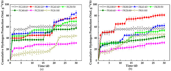 Cumulative hydrogen production for the thermophilic dry anaerobic co-fermentation of (a) FW + GW and (b) FW + KW.