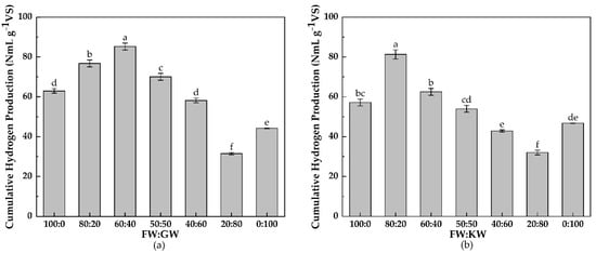 Cumulative hydrogen production on the 30th day for the thermophilic dry anaerobic co-fermentation of (a) FW + GW and (b) FW + KW. Letters indicate significant differences between the different mixing ratios (p < 0.05).