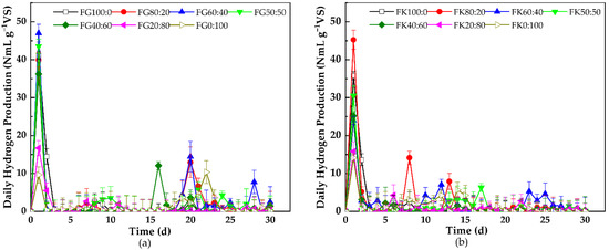 Daily hydrogen production for the thermophilic dry anaerobic co-fermentation of (a) FW + GW and (b) FW + KW.
