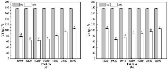 Changes in the VS contents for the thermophilic dry anaerobic co-fermentation of (a) FW + GW and (b) FW + KW. Letters indicate significant differences between the different mixing ratios (p < 0.05).