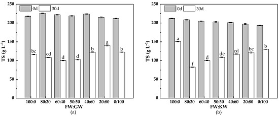 Changes in the TS contents for the thermophilic dry anaerobic co-fermentation of (a) FW + GW and (b) FW + KW. Letters indicate significant differences between the different mixing ratios (p < 0.05).
