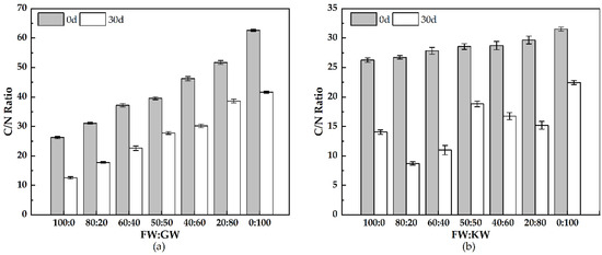 C/N ratios for the thermophilic dry anaerobic co-fermentation of (a) FW + GW and (b) FW + KW.