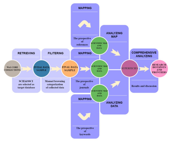 VOSviewer and CiteSpace were used for bibliometric analysis. Van Eck and Waltman proposed a new visualization method for node similarity [33,34] and integrated this algorithm into VOSviewer software. The foundation of this algorithm enables VOSviewer to visually express the correlation strength between two nodes in the visual analysis, and the visual effect is intuitive. Therefore, VOSviewer will be used when it is necessary to highlight the clustering relationship and the closeness of the connection between nodes. In addition, CiteSpace was used to display the evolution of literature information more intuitively over time [35,36,37,38]. The methods and processes used in the research are shown in Figure 1.