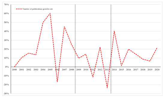 The preliminary development stage (2000–2007). A total of 510 papers were published in the eight years during this stage, accounting for 13.70% of the statistical data, and 63.75 papers were published annually. Moreover, the annual number of publications in the eight years was lower than the average level, and the growth rate was relatively slow.
