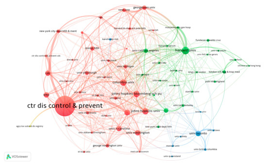 VOSviewer was used to screen out institutions with a starting volume of less than 15 and obtained 66 institution records. The knowledge map of the organization co-authored network is shown in Figure 4. The node diameter has a positive correlation with the literature amount, and the node connection width has a positive correlation with the cooperation intensity. It can be seen that the cooperation between the Centers for Disease Control and Prevention and Johns Hopkins University is the most frequent. Each color in Figure 4 represents a cluster, and the calculation generates four clusters. The red and green clusters are relatively large clusters, while the yellow cluster has only one node. The red cluster contains 35 nodes and has the largest node, for the Centers for Disease Control and Prevention, in the entire graph. The research content of the institutions in the cluster involves public health problems with different age groups [61,62,63], global public health emergency response capabilities [64,65,66], the use of modern methods to improve public health response speed [67,68] and hot issues [69,70,71,72]. The largest node in the green cluster is Harvard University; the institutions in the cluster mainly focus on public health issues caused by climate change [73,74,75], air environmental issues [76,77,78], and hot social issues [79,80]. There are eight nodes in the blue cluster, and the University of Toronto is the largest node among them. Institutions within the cluster have conducted extensive research on information transmission in the event of a public health event [81,82,83], improving response and recovery capabilities [84,85,86].