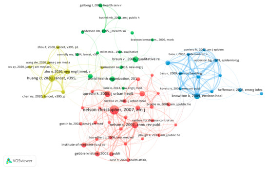 Green cluster: Braun [94]’s (26 co-citations) article was the most frequently cited one in the cluster, and found that topic analysis was an effective and flexible method in psychological research, which can be combined with some parts of public health emergency management. Moher [95] (21 co-citations) found that systemic reviews and meta-analyses are becoming more and more important in health care, and developed a system of Preferred Reporting Items for Systemic Reviews and Meta-analyses to explore the practical effects of existing research topics. Andersen [96] (19 co-citations) points out that the Behavioral Model of Health Services Use has been in use for many years and assesses the implications for sustainability. This cluster discusses the introduction of more research and analysis methods or models into public health emergency management through interdisciplinary and cross-cutting approaches.