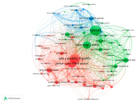 For the three clusters of red, green and blue, the number of red cluster nodes is the largest. Among them, the journals with higher numbers of co-citation were the American Journal of Public Health (1618 co-citations), Jama-journal of The American Medical Association (1311 co-citations), Annals of Emergency Medicine (806 co-citations), Pediatrics (631 co-citations), and Disaster Medicine and Public Health Preparedness (584 co-citations), and their focuses were on improving public health. The green cluster is based on Lancet (1724 co-citations), New England Journal of Medicine (1228 co-citations), Emerging Infectious Diseases (804 co-citations), Social Science & Medicine (709 co-citations), and PLoS ONE (698 co-citations). The cluster focuses on papers that are likely to change clinical practice or innovative research on certain diseases. The main journals in the blue cluster are Environmental Health Perspectives (753 co-citations), American Journal of Epidemiology (425 co-citations), International Journal of Environmental Research and Public Health (399 co-citations), Epidemiology (347 co-citations) and Journal of Epidemiology and Community Health (326 co-citations). The focus is mainly on epidemics. In terms of the number of co-citations, the American Journal of Public Health, Lancet, and Environmental Health Perspectives were the highest in each cluster and could be considered core journals with different research orientations.
