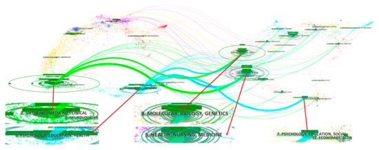 The dual-mapped overlay view of the cited journal type and the number of focus papers is shown in Figure 7. The labels in the figure represent the research content of each journal. The cited journal labels are on the left side of the figure, and the cited journals are on the right. The trail of citation links provides an understanding of the relationships between disciplines. The change in the trajectory from one field to another indicates that one discipline is influenced by the papers of another [28,110].