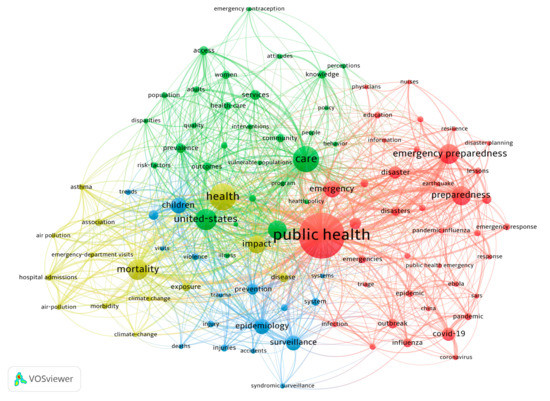 Red cluster: As shown in Figure 8, “Public health” (462) is the most frequent node in this cluster. “Emergency preparedness” (177), “preparedness” (170), “emergency” (140), and “COVID-19” (110) are other keywords with a high frequency. It can be considered that the cluster as a whole revolves around the keywords “public health” and “emergency preparedness”, focusing on the continuous improvement of public health emergency management capabilities. Pestronk [112] earlier proposed that funds should be fully utilized to train talents, which can provide reserves for both emergencies and government public health departments. Nelson [113] reviewed the previous public health emergency management methods and proposed adding some emerging technologies to better respond to emergencies. Bochenek [11] proposed a new conceptual framework that integrates public health and traditional emergency management so that it can be applied more dynamically and flexibly according to the actual situation. Bardosh [114] proposed that social science-related knowledge should be incorporated into the prevention and response to epidemics. Through comparison of the response to COVID-19 and Ebola, many gaps were found and recommendations were made. COVID-19 has become a subject of much concern in clustering in the past year, and scholars from different countries have studied it from different angles, including the psychological state of medical workers [115], basic cognition of medical workers [116,117], port management [118] and drug use management [119]. After a period of anti-epidemic struggle, He [120] found that he could better prepare for and respond to the pandemic through experience. Ortega [121] proposed countermeasures to improve the health equality problem caused by language differences.