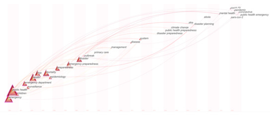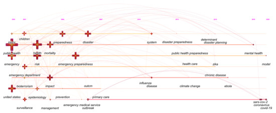 Table 6 is obtained from burst detection in CiteSpace, and the 15 keywords with the highest burst strength and relevant information are listed below. Burst strength was used to describe the degree of a great increase in the occurrence frequency of a keyword. The higher the burst strength is, the greater the increase in the occurrence frequency of the keyword within a short time. It can be seen that the keywords with high outbreak intensity are constantly changing, and the strongest ones are “Bioterrorism” (17.5), followed by “Ebola” (11.96), “Public Health Preparedness” (10.7), “Health Care” (9.74), and “Influenza” (7.97). “Emergency” is one of the earliest burst times, and “Air Pollution” and “Bioterrorism” have the longest burst time. It can be seen that scholars have long focused on the themes of “air pollution” and “bioterrorism”, and that bioterrorism is no longer the focus of attention in today’s world. “Climate Change” related to “Air Pollution” is a keyword that is undergoing a sudden change. Due to the limitation of calculation and data, the keyword “COVID-19” is not reflected in the table. Combining the previous research shows that “COVID-19” will also become a keyword with great mutation intensity in the future.