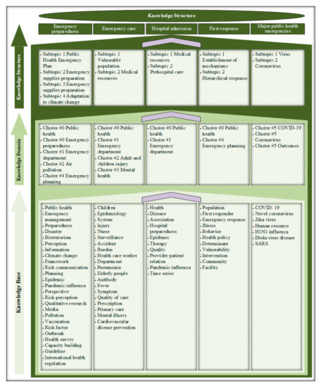 From the above analysis, it can be seen that the research on public health emergency management involved a wide range of fields and was intensively interdisciplinary. The overall knowledge structure can be divided into five main research directions, including emergency preparedness, emergency care, hospital admission, first response and major public health emergencies (see Figure 11). The corresponding knowledge bases and knowledge domains are shown in Figure 11.