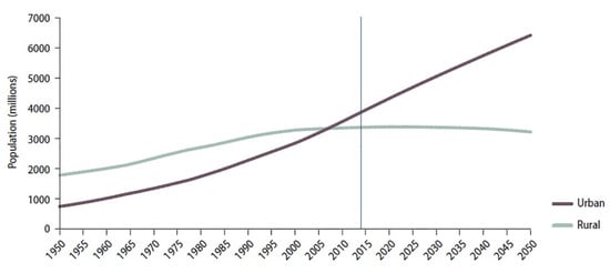 Since 2009, for the first time in history, the total number of people living in urban areas (3.42 billion) has exceeded the total number of individuals dwelling in rural areas (3.41 billion). Since 1950, the world has been witnessing rapid urbanization; it is apparent that the world has become more urban than rural [8,9]. It is estimated that the globe’s population will reach 8.5 billion by 2030 and 9.7 billion by 2050 [10,11,12,13]. It is estimated that the population of urban centers will reach 6.3 billion by the year 2050 [8,9]. It is projected that by 2030, roughly 60% of the world’s inhabitants will reside in cities. By the year 2050, it is projected that 68 percent of the global population will dwell in urban centers [9,14,15,16]. It is predicted that most population growth will be concentrated in congested urban centers, particularly in major cities and towns in developing countries. According to the mentioned statistics and projections, it is evident that current and future urban growth is inevitable [17,18] (Figure 1 and Figure 2).