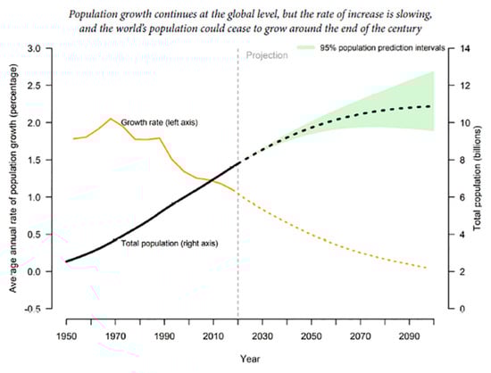 Population size and annual growth rate for the world: estimates, 1950–2020, and medium-variant projection with 95 per cent prediction intervals, 2020–2100 [12].