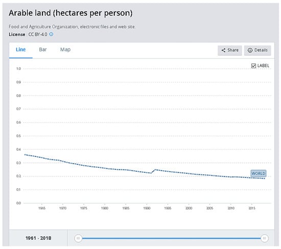 The prolonged decrease in agricultural land stock per capita is becoming an evolving global issue. The global arable land (hectares per person) has nearly declined by half from 0.361 in 1961 to 0.184 in 2018. It is projected that by 2050, the amount of available cultivable land per person will decrease to one-third of the amount available in 1970 [19,20] (Figure 3). The decline in arable land per person in Cyprus from 1961 to 2018 also matches the global pattern. The percentage of arable land has dropped from 35.6% of land area in 1961 to 11.3% of land area in 2018 [21] (Figure 4). This decline is estimated to continue due to population growth, urban growth, effects of climate change, scarcity of fresh water sources, soil depletion and degradation, desertification, over-farming, and poor agricultural practices. The decline in global arable land means that there will be a shortage of farmlands that is crucial to feed the growing population [20,22,23,24,25]. Population experts predict that approximately 2 to 4 billion people will be added to the global population within the next 3 to 4 decades [10,13,22,26]. Despite population growth, the available arable land continues to decline due to the mentioned issues [22].