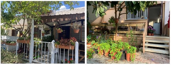 In the case of detached villas and semi-detached villas, containers and pots of various sizes are arranged in the doorways. If a ceiling protects the doorway, suspended baskets are usually hung from the ceiling. Small pots are generally arranged in window sills. In the case of villas with balconies, railing planters are installed on balustrades. Containers of various sizes and pots are arranged on the balcony floors. Suspended baskets are hung from the balcony ceilings. In some balconies that are not covered, trellises are added to the balconies to support grapevines. In detached villas and semi-detached villas, external walls and roofs are seldom used for arranging green decorative elements. Fruit trees (walnut, fig, lemon, orange, almond, strawberry, and grapevine), vegetables (lettuce, tomatoes, and peppers), and herbs (basil, coriander, rosemary, mint, and parsley) are usually planted within the visited gardens. The harvest is either consumed by the household or shared with family members and friends. Containers and pots of various sizes are usually arranged in the gardens. In some gardens, trellises are made to support the grapevines. In some gardens, wooden shelves are made, and pots and containers of various sizes are arranged. Railing planters are typically installed if the garden wall is made out of a fence (Figure 5, Figure 6, Figure 7 and Figure 8).