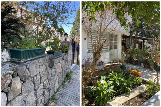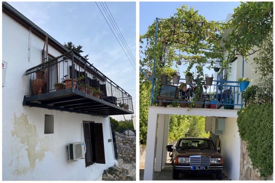 This research is based on qualitative methods for data gathering [114]. To gather data, various field works were conducted in the Kyrenia district (Kyrenia and Lapta) during the spring and summer of 2021. The field works’ principal aim was to record how local Cypriots in the Kyrenia district arrange and maintain their green decorative elements and their edible gardens within their residential houses. The typology of residential buildings selected as case studies included the following: (1) detached villas and semi-detached villas, (2) row houses, and (3) apartment buildings. For each selected case study residential building, the following spaces are studied: doorways, window sills, balconies, external walls, rooftops, gardens, and garden walls.