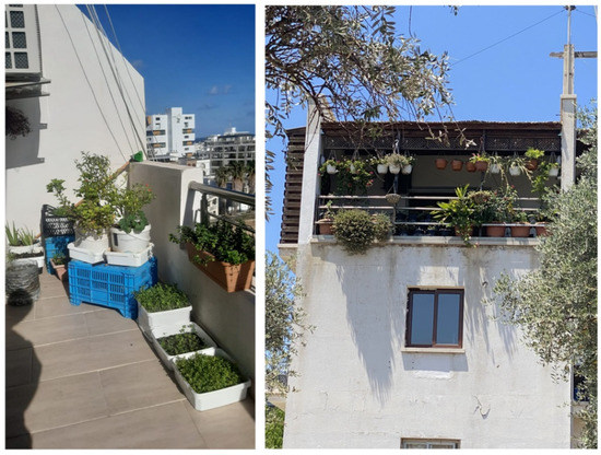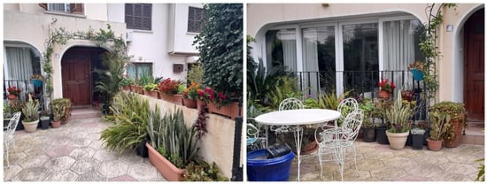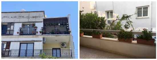 Considering the apartment buildings, the available spaces dedicated to green elements are limited compared to the detached villas, semi-detached villas, and row houses. Decorative green elements are commonly used in the ground level of the visited apartment buildings. Containers and pots of various sizes are placed in the entrance areas, doorways, and gardens. In some cases, window sills are used for small pots. In some apartment buildings, French windows are installed. In such cases, small pots and containers are placed on sills. Balconies are usually decorated with greenery. Balcony railing planters are installed on balustrades. In some cases, baskets and pots are suspended from the balustrades. Containers and pots are put on the balcony floors. Suspended baskets are hung from the balcony ceilings. Shelves are attached to the balcony walls, and pots of various sizes are put on the shelves. The external walls and rooftops of the apartment buildings are seldom used for arranging green decorative elements. The practice of arranging and maintaining green decorative elements in apartment buildings with limited spaces demonstrates that Cypriots living in apartment buildings are eager to keep and maintain their relationship with greenery (Figure 13, Figure 14, Figure 15 and Figure 16).