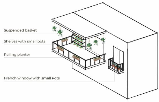 Balconies can be considered as spaces which have the potential of growing food. The preferable direction for balconies regarding sunlight is south, south-east, and south-west. Containers and pots should be located where they receive the maximum daylight; shaded spots should also be avoided. Windscreens can be installed to protect the plants from severe winds. Balcony floors, railings, and adjacent walls are ideal spaces for setting up the edible garden. Containers of various sizes can be arranged on the balcony floor. Balcony railing planters can be installed along the railings. Railing planters are exposed to daylight, and they hang off the balcony. In balconies where space is limited, suspended baskets can be installed to maximize the amount of growing space. Suspended baskets can be hung from the balcony ceiling, adjacent walls, or the balustrades [97,98].