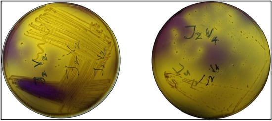 Milk effluent samples were collected from: 1. Aavin Milk Co., Sivagangai District Cooperative Milk Producers’ Union Ltd., Karaikudi, Tamil Nadu, India; 2. Aavin Milk Co., Madurai, Tamil Nadu, India; and 3. SPS Milk Industry, Dindigul, Tamil Nadu India (Figure 1A,B). Samples were subjected to serial dilution and spread plate technique on MRS media (pH 7.2) supplemented with 0.12 gm/L of l-cysteine hydrochloride [,] as an oxidizing agent to suppress other non-lactic acid producing bacteria and to enhance the growth of the desired lactic acid producing bacteria (LAB) (Table S1). Morphologically different microbial colonies were isolated and continuously sub-cultured on MRS media (Table S2) and they are preserved in (50%) glycerol for long-term storage. Isolates were tested for the Lactic acid production through the Bromocresol Purple MRS Agar Medium (BCP-MRS) plating technique as described by [,,] (Figure 2).