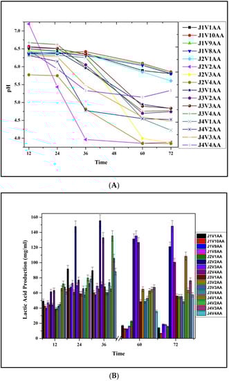 16 isolates were subjected to fermentation and 6 isolates among them showed promising LA production. In the 6 isolates, 2 isolates denoted as J2V2AA and J2V4AA showed a significant reduction in the level of pH with more acidity due to LA production. J2V2AA showed maximum LA production (147.8 mg/mL) in the short span of 24 h. In the overall experiment, on the completion of the experiment, i.e., 72 h, Maximum LA was produced by two isolates J2V2AA (155 mg/mL) and J2V4AA (133 mg/mL) (Figure 4A,B, Table S3). All the isolates showed a decline in the LA production after 24 h of the experiment, May due to the feedback mechanisms, i.e., reutilization of LA thus reduces the LA production [,]. In both isolates, there are no significant differences were found after the 24 h of the fermentation, it has also been an advantage that both isolates produce LA in a short span of fermentation.