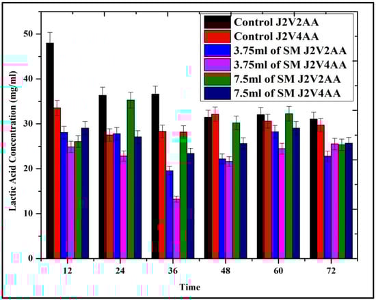 The two best LA producing bacteria were primarily tested for the production of LA using Sugarcane Molasses as a carbon source. Both strains (J2V2AA and J2V4AA) utilized the Sugarcane Molasses and produced Lactic acid viz., 28 mg/mL/24 h and 24 mg/mL/24 h, respectively. Similar to the screening test, after 24 h of fermentation, no significant differences were found in terms of LA production, which confirms that the isolates are capable of producing LA in a short duration, which is of paramount importance for large scale productions. The bacterial isolate J2V2AA was chosen for further experimental assays based on the pH analysis and LA production (Figure 5, Table S4).