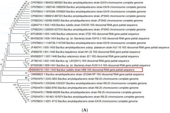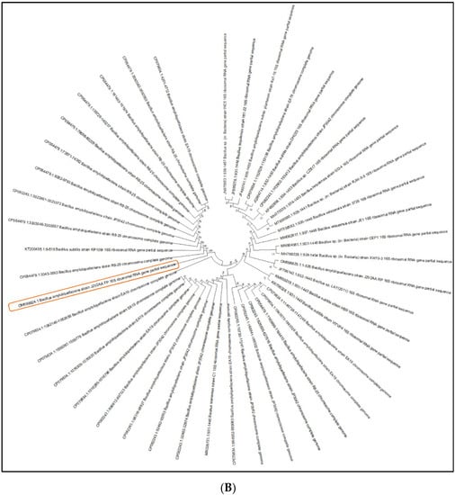 The J2V2AA was identified as Non-fastidious Bacillus amyloliquefaciens molecularly using 16S rRNA Sanger Sequencing. The best-producing isolate was sequenced against 16SrRNA Sequencing and BLASTed. Based on the E Value and Percentage of Match the isolate was confirmed as Bacillus amyloliquefaciens and the phylogenetic tree was constructed (Figure 6A,B). The sequence of the isolates was submitted to GenBank with an accession numbers (OM698825 and OM698824).