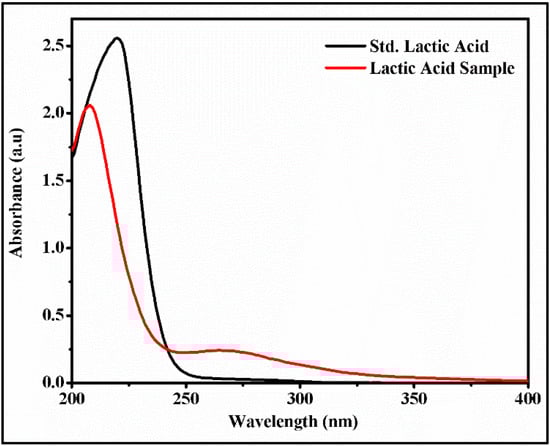 The microbial fermented lactic acid was further characterized by a UV-visible spectrophotometer compared with the standard lactic acid. A peak between 200–250 nm and ~225 nm represents the presence of lactic acid in the sample (Figure 7).