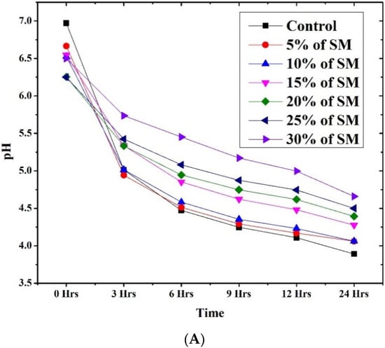 Different concentrations of SM were supplemented to optimize the best combination for the highest production of LA as the isolates are capable of producing LA by utilizing SM to replace Glucose. Bacillus amyloliquefaciens strain J2V2AA showed the maximum LA production of 178 mg/mL/24 h in mMRS supplemented with 30% Sugarcane Molasses (Figure 8C). pH analysis resulted in a decrease in the level of pH from 6.5 to 4.6 (Figure 8A). The obtained results are comparable with other literature data [], up to 30% of Sugarcane molasses showed improved production of LA which is similar to that of the result obtained by [,]. It is suggested that more than 40% of SM showed the deprivation of LA [] due to maybe the presence of entrained hazardous substances and high sugar concentration [].