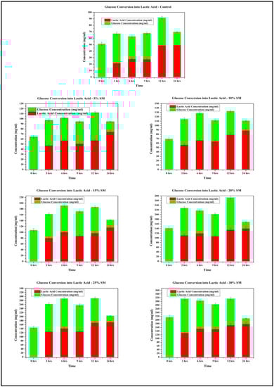 During the initiation of the fermentation, the pH of the media was around 6.5 to 7, which gradually reduced to 4.75 to 5.75 after 3 h of fermentation denoting the production of LA. At the 24 h of fermentation, the pH of all concentrations was brought down to less than 4.5. Simultaneously the glucose concentrations were also gradually converted to LA. At the initial stage of the fermentation, the glucose concentration of 30% SM was around 225 mg/mL which gradually reduced to around 25 mg/mL at 24 h of fermentation (Figure 8B, Table S5). All the glucose concentration of SM was brought down at the end of the fermentation. The control glucose was also reduced and converted into LA, but the conversion rate was slow in the control and the rate of conversion of SM into LA was higher which could be distinguishably observed in the inter-conversion plate. Initially, at 0 h of the fermentation, no LA has been produced or negligible which is indicated in the plate. Then, inter-conversion was observed in the 3, 6, 9 and12 h in the plate and at the 24th hour of fermentation, the maximum amount of glucose was converted into LA (Figure 9). The conversion into LA was higher in the SM as it contains a high glucose concentration in it. The productions of LA were compared with the other kinds of literature (Table 1), which describes that the LA produced through this study was higher.