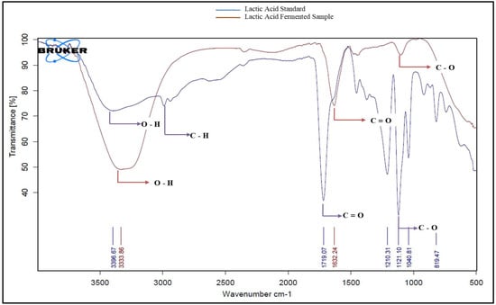 Lactic is a Bi-functional molecule with one Carboxylic acid with a hydroxyl group. The microbial fermented lactic acid was separated from the MRS media through downstream processing. The LA were analyzed and compared with standard lactic acid through FT-IR Spectrum (Figure 10), the –OH bond stretching was observed at 3396 cm−1 in standard LA, and 3333 cm−1 in Microbial fermented LA. A band at 1719 cm−1 and 1632 cm−1 represents the C = O stretches, 1121 cm−1 represents C–O stretches [].