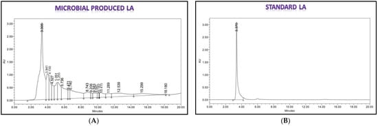 (A) HPLC analysis of Microbial Produced Lactic Acid; (B) HPLC analysis of Standard Lactic Acid.