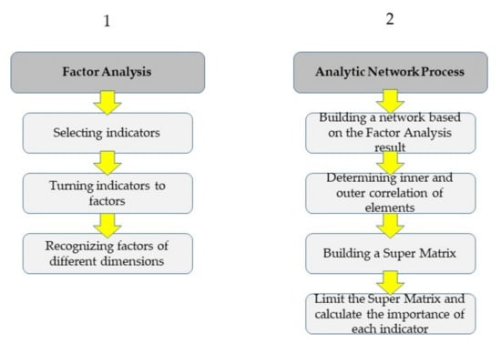 The needed data in 2006, 2011, and 2016 were gathered from Census data which was produced by the Statistical Center of Iran []. In order to assess the SSI of Iran’s regions, the authors used the F’ANP model. Figure 2 presents the framework of the F’ANP model. In this figure, bold phrases demonstrate the main phases of the F’ANP model, while others show steps below each phase.