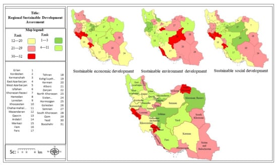 After implementing the F’ANP model, the importance of each of the 58 indicators was evaluated. Subsequently, with the contribution of these indicators, Iran’s provinces would be rated in economic, social, and environmental dimensions. Table 9 demonstrates the rating of Iran’s provinces based on these dimensions.