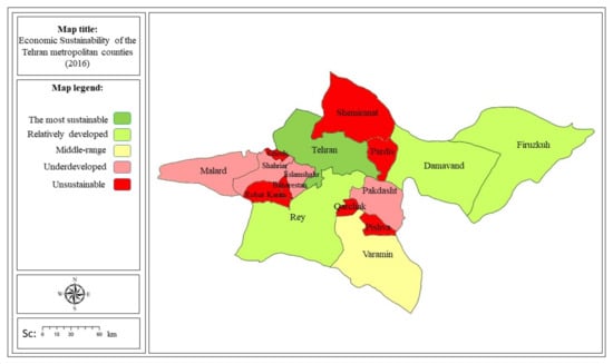 After implementing the F’ANP model for Tehran’s counties, the importance of sustainable development indicators was cleared. Table 11 shows the importance of economic indicators in this assessment. Upheavals of sustainability in this region are shown in Table 12, and Figure 9 demonstrates the economic sustainability of Tehran’s counties during a decade.